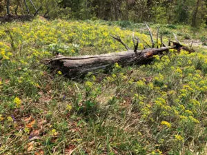 På bjerghylder er der små urørte arealer – som her hvor der er julerose, mælkeurt og vortemælk.