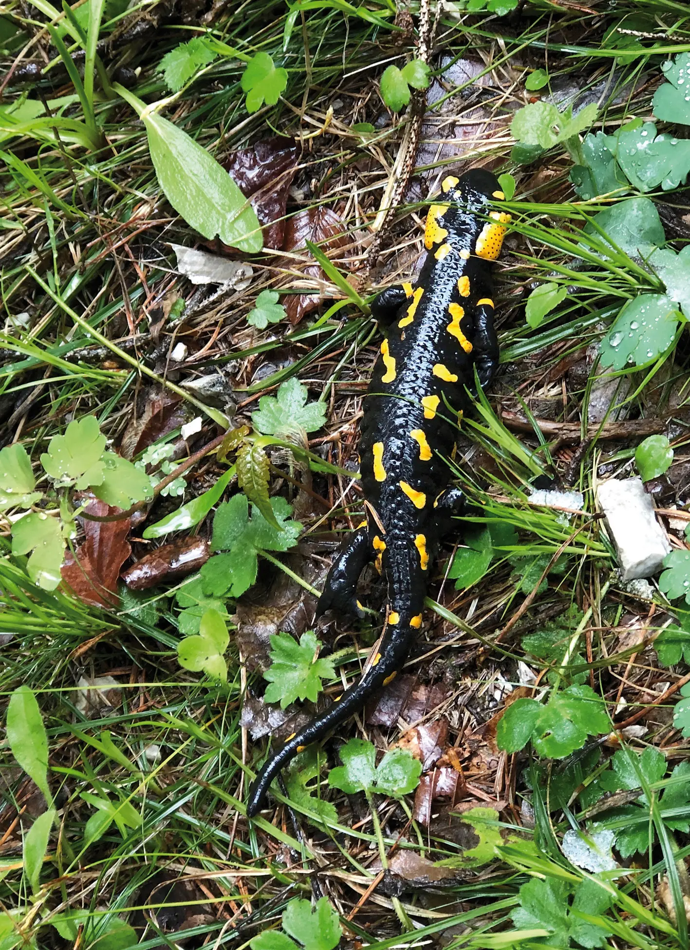 Mest specielt var måske mødet med ildsalamander, en stor salamander der med sine lysende gule pletter traskede over den smalle sti. Den gemmer sig ofte om dagen, men kommer frem efter regn for at gå efter snegle, orme m.m. Det er en salamander man ikke skal tage op da den udskiller et giftsekret som både kan give udslæt og kvalme. Vi nøjedes da også med at følge dens tur over stien.