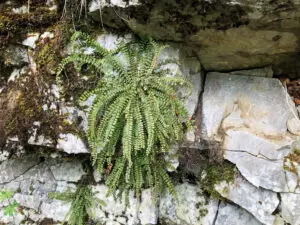 I kalkstenens sprækker og revner trives mange forskellige arter, f.eks. rundfinnet radeløv.