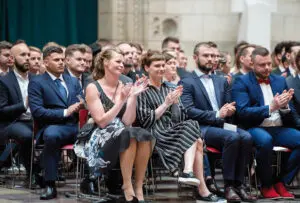 Stine Dohn Larsen og Maja Marqvard Christensen på forreste række til Håndværkerforeningen Københavns Medaljefest på Københavns Rådhus hvor de fik sølvmedaljer for deres svendeprøver. Foto: Henrik Nielsen.