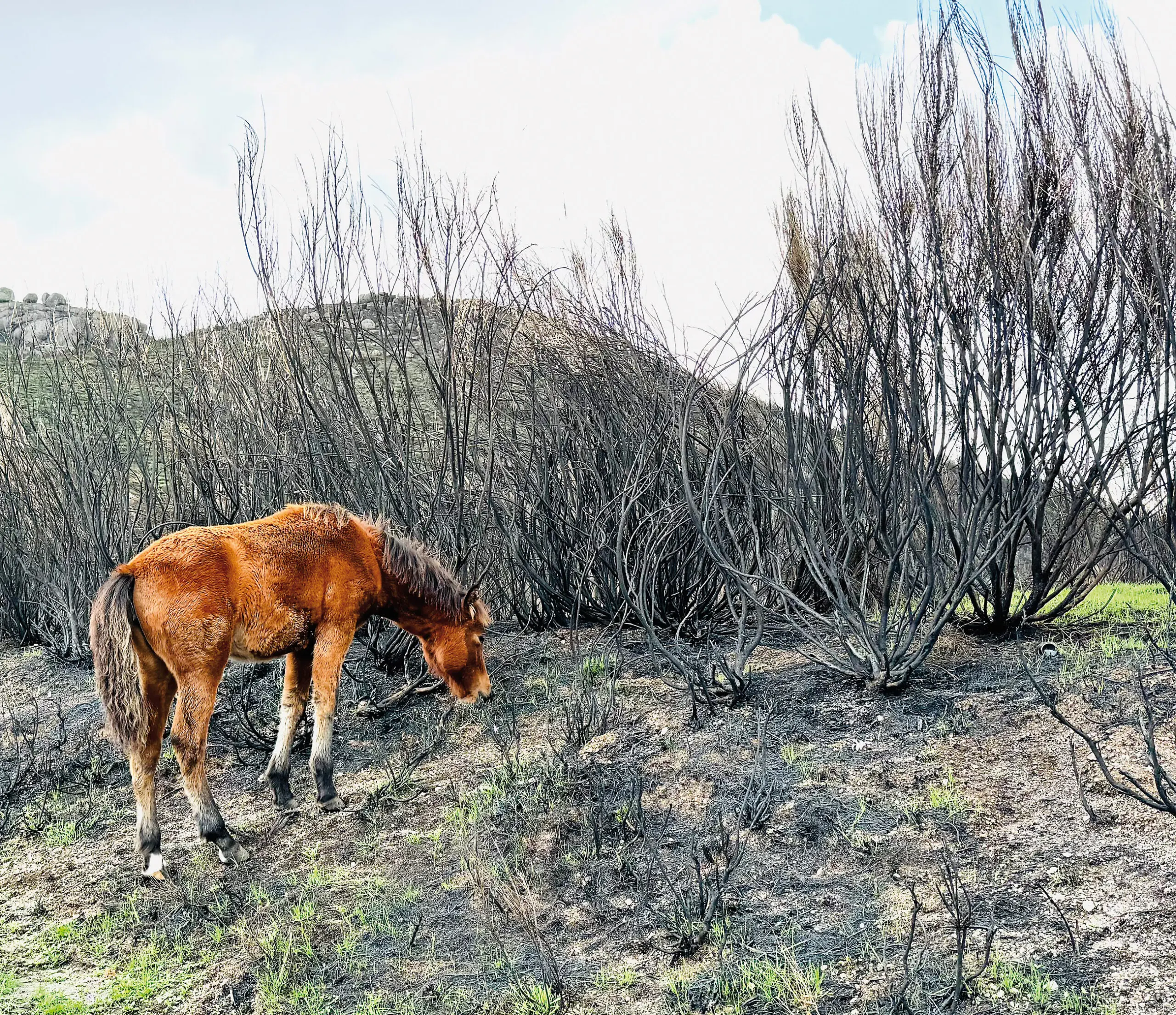 De vilde heste finder ny frisk opvækst efter en voldsom skovbrand som kostede både menneskeliv, skovens vildt og store arealer med naturskov brændt i bund. Branden er tilsyneladende påsat eller i hvert fald menneskeskabt. Tørken har kun gjort det hele værre.