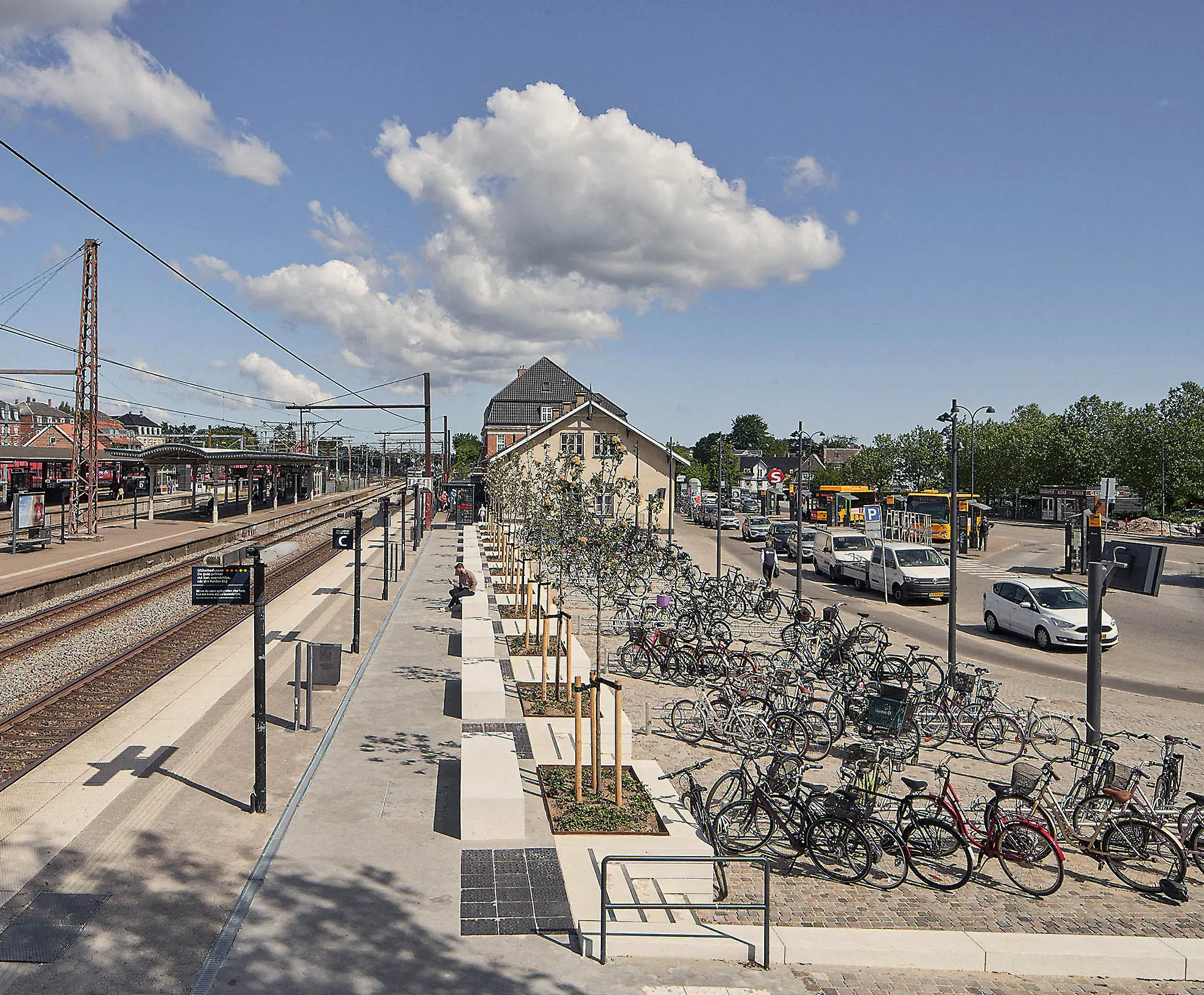 I dag er der ét stort åbent og tryggere byrum hvor man færdes på kryds og tværs med mulighed for ophold, bl.a. mellem de nyplantede opstammede træer. Perronerne er en integreret del af det nye byrum, og de ventende passagerer er en integreret del af bylivet, skriver de tre Arkitemafolk der ser lyst på udviklingen: