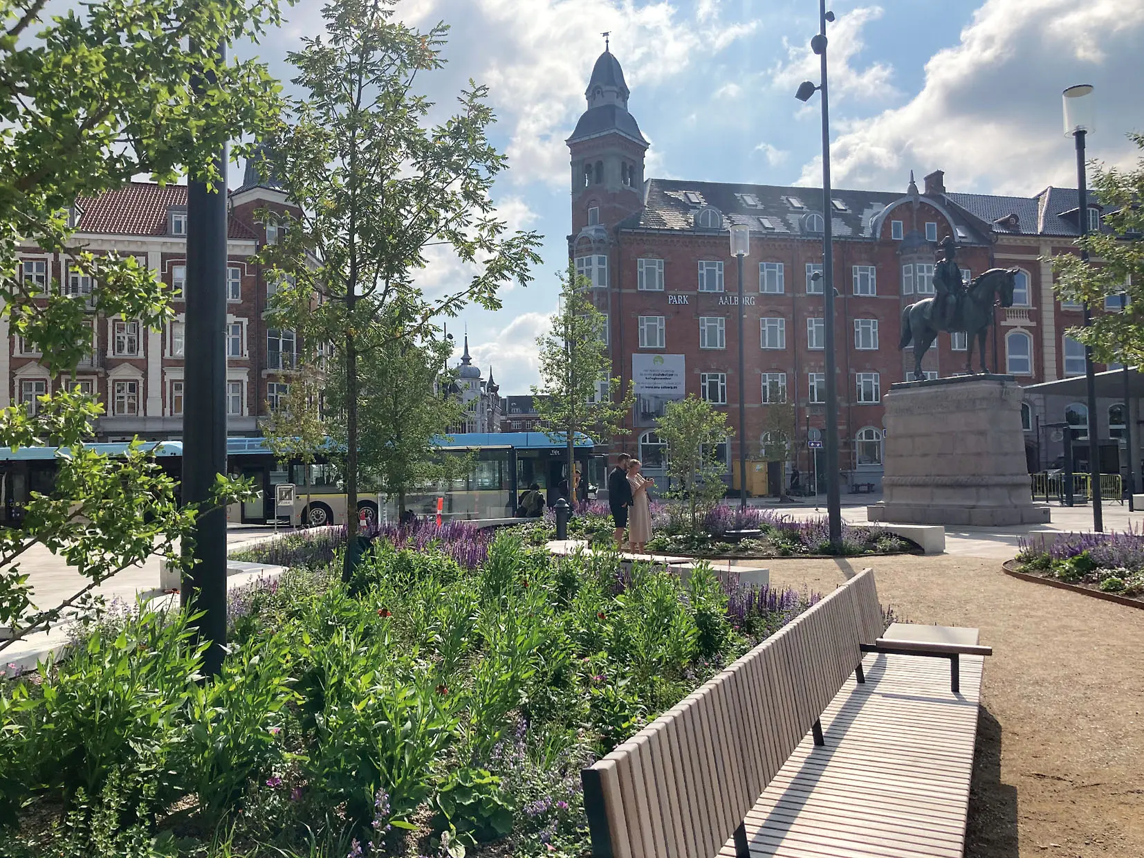 På Kennedy Plads i Aalborg er banegårdspladsen blevet til en grøn oase selv om der stadig er busser. Omkring 6.600 m2 er beriget med frodige bede mens nye træer supplerer pladsens gamle træer. „Sidder man og venter på bussen, dufter man det grønne lige bag ryggen,“ skriver de tre Arkitemafolk. „Skygge er en ny og behagelig ting der har givet flere gode pausesteder ligesom solen får frit spil andre steder på pladsen. Hvor den dominerende stemning før var hektisk aktvitet og travlhed, har en fornyet ro sænket sig over bylivet.“