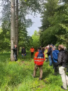 Palle Kristoffersen fortæller om poppelklonen OP42’s vækst. Til højre for ham er Bühler klar til at gribe ind.