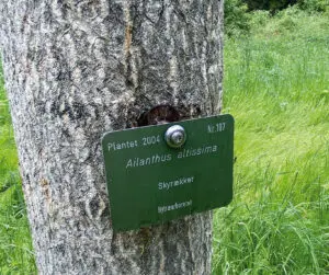 Gik fra træ til træSkyrækker (Ailanthus altissima) er også plantet i Bytræarboretet og er forsynet med skilt. Det vokser fint og er velegnet som bytræ. Men arten er erklæret invasiv i hele EU og må derfor ikke anvendes længere.