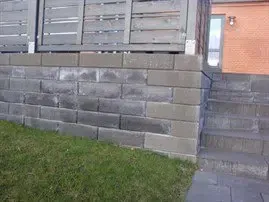 En støttemur hvor der er farveforskel i betonstenen langs top og kant i forhold til selve vægfladen. Stenene kommer ellers fra samme fabrik, der anvender samme opskrift. Eneste måde...