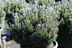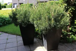 Bjergfyr, Pinus mugo, er en grøn og velforgrenet busk der fås både som art der ses her, og i forædlede sorter til mange formål, også i store kummer og krukker som her. Ved at klippe planterne omkring 1. juni kan du holde planten tæt og velforgrenet.