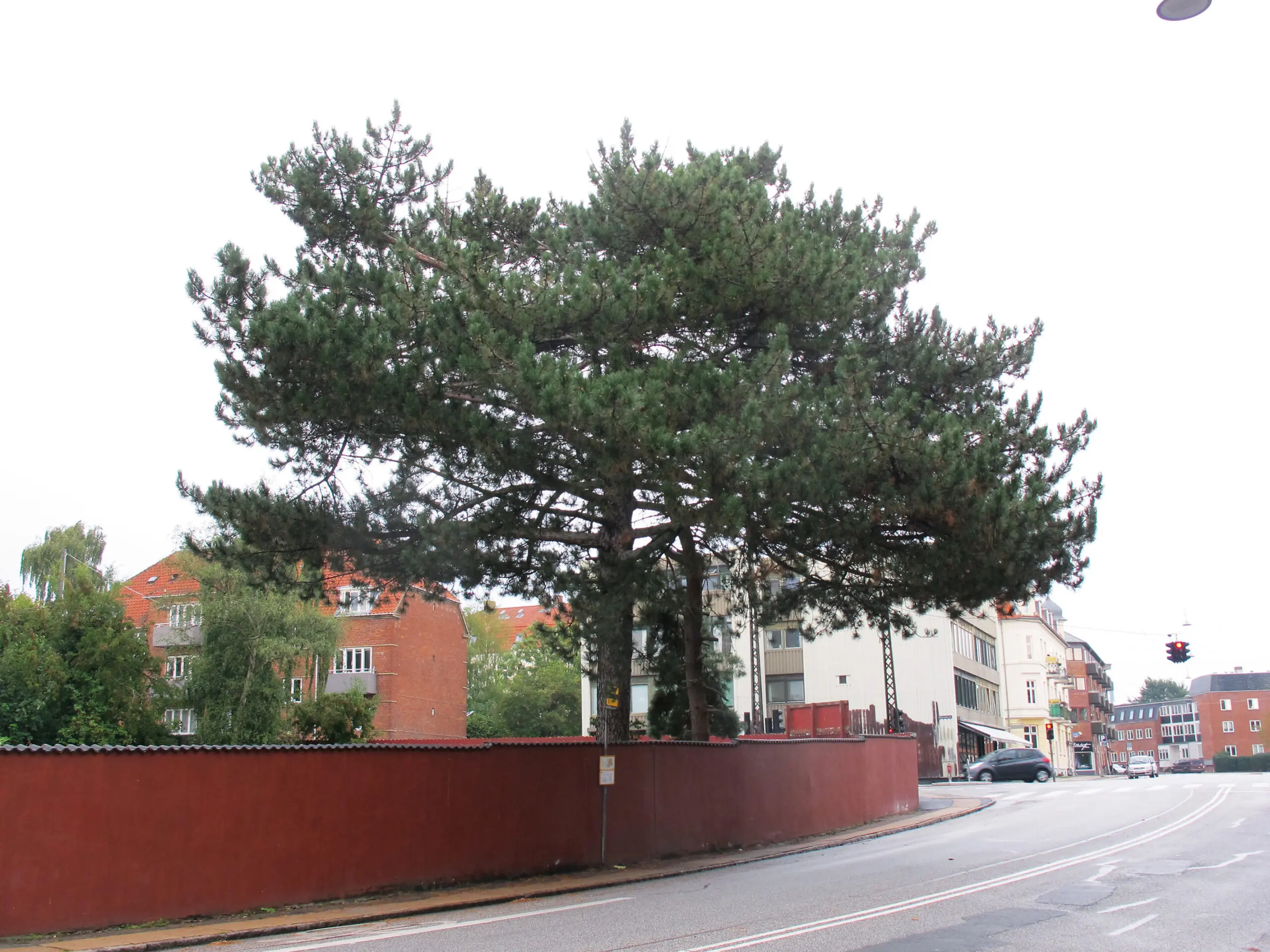 En skovfyr står på et udfordret sted ved vej, mur og stoppested, men har her efter tørken stadig livskraft.