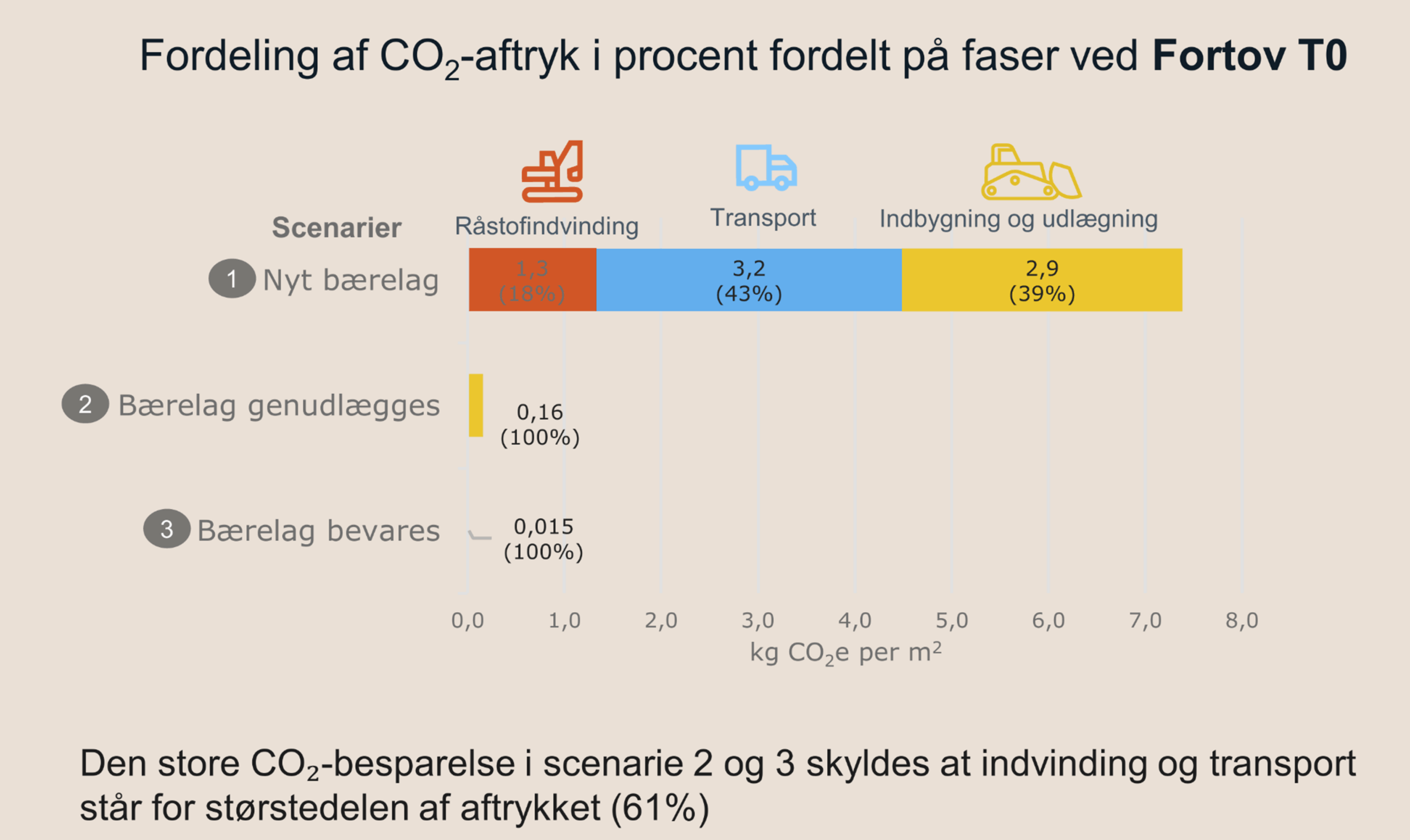 Fordeling af CO2-aftryk i % ved fortov T0 Den store CO2-besparelse i scenarie 2 og 3 skyldes at indvinding og transport står for størstedelen af aftrykket (61%). Råstof-Initiativet har påvist det voldsomme ressourceforbrug ved at anlægge nyt fremfor at genanvende i denne enkle tabel. Her ses CO2 forbruget ved henholdsvis: 1) Udskiftning af eksisterende bund med nye råstofmaterialer (den opgravede bund bortskaffes). 2) Opgravning og genudlægning af eksisterende råstofmaterialer (den opgravede jord lægges i matriklen). 3) Eksisterende bund bevares (der foretages kun en let regulering af bærelaget ). Resultatet er en CO2-besparelse på 97,7% i scenarie 2 og 99,8% i scenarie 3 i forhold til scenarie 1. Illustration: Cowi / Råstofinitiativet.