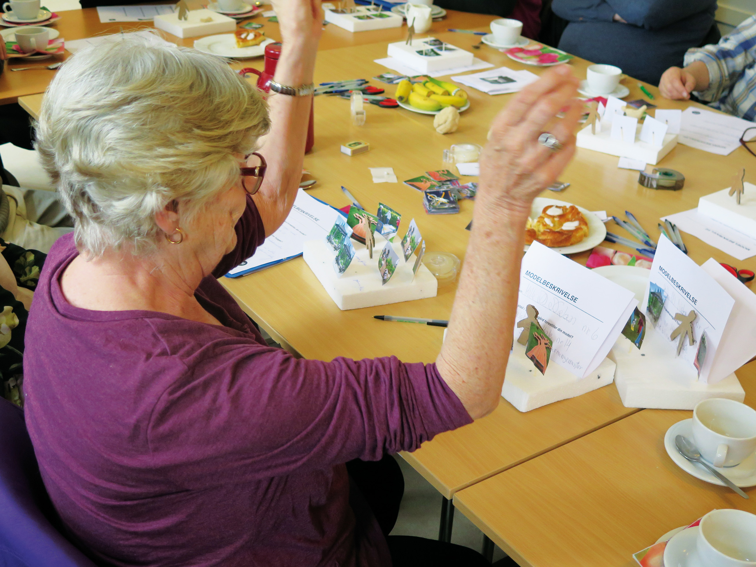 Som en del af projektet deltog de ældre i en idéworkshop. Her stødte Sidse Carroll og hendes kollega på den uforudsete udfordring at nogle af de ældre følte sig talt ned til som børnehavebørn da de skulle sidde med skitser, modeller og billeder. Det var nødvendigt at forklare at sådan arbejder arkitekter og designere selv. Foto: Sidse Carroll.Co-design med ældre