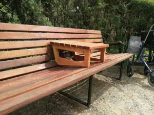 Mange bænke har ingen armlæn og bliver fravalgt af visse grupper af ældre. Det samme bliver midterpladsen ofte da der er for langt til at nå armlænene. Som en del af projektet i Tranhavegård udviklede Sidse Carroll et add-on-bord og armlæn som udvidede bænkens sociale og funktionelle brugbarhed. Foto: Sidse Carroll.