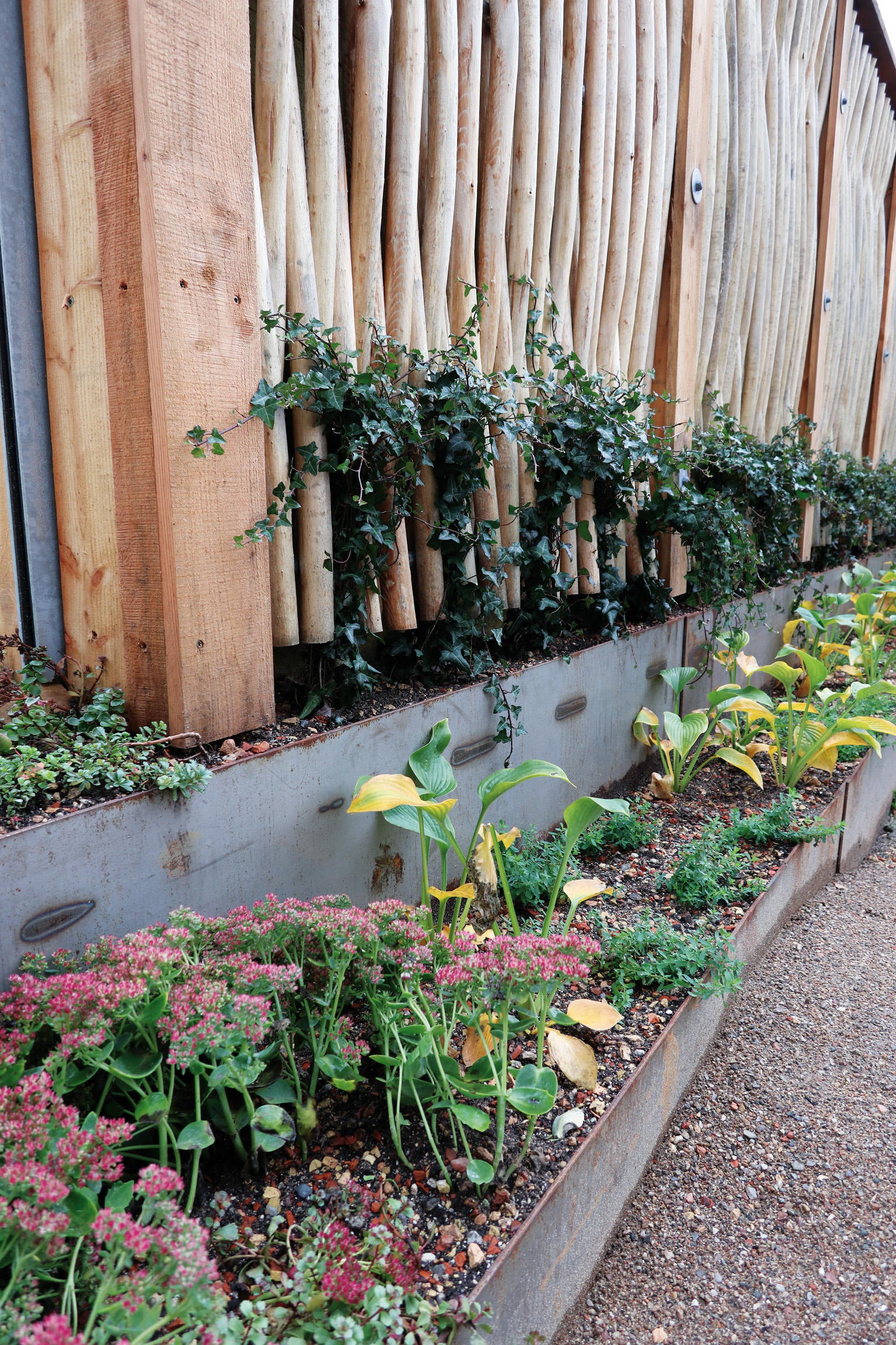 Plantekassen har to terrasser. I den øverste er der primært slyngplanter. I den nederste er der lavere dækplanter mellem slyngplanterne.
