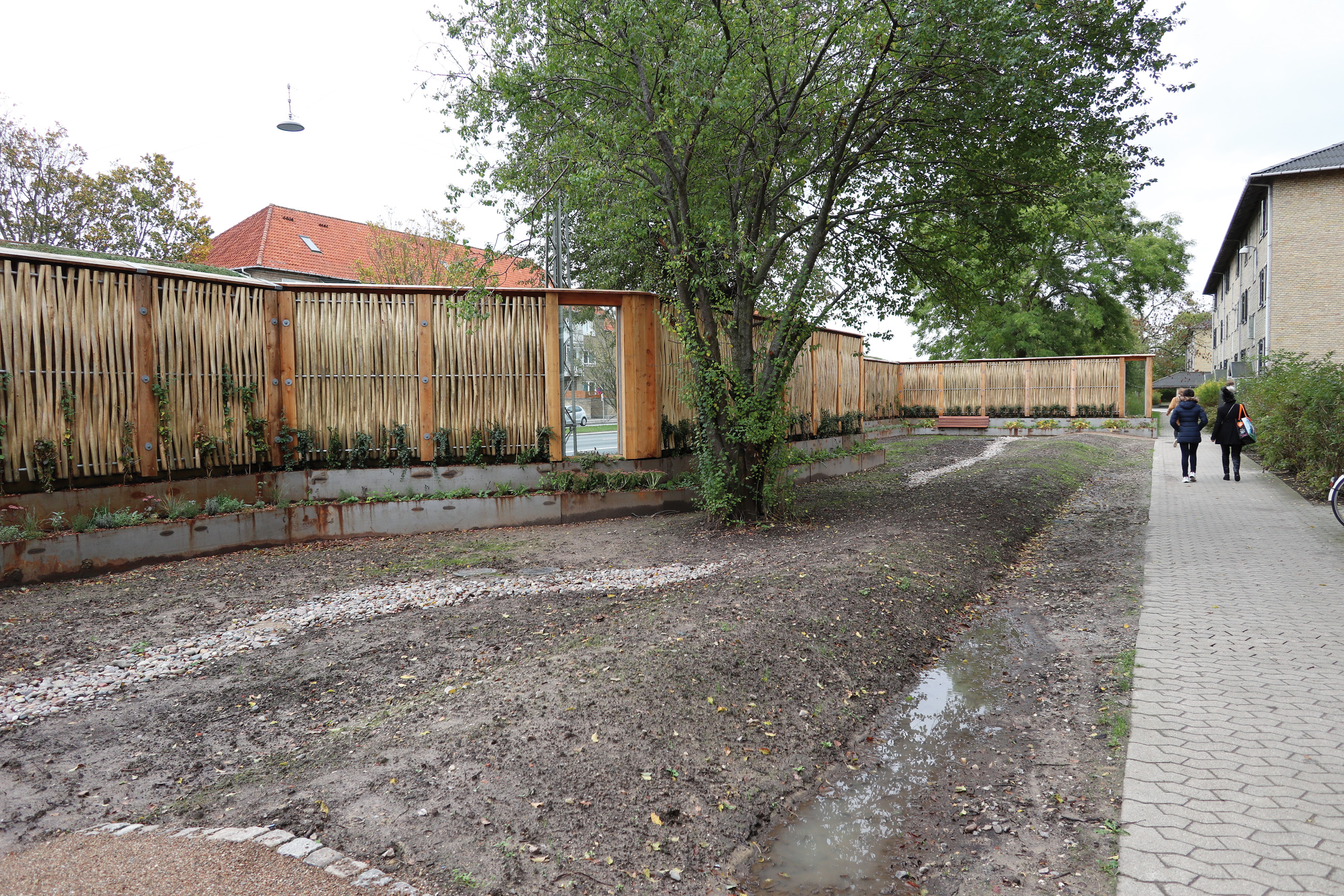 Under ekstremregn dirigeres overskydende vand fra bundkassen ind mod det grønne areal mellem ejendom og skærm der fungerer som et bassin og en grøft. I døgnet inden billedet blev taget havde det regnet ret kraftigt, men der var alligevel kun lidt vand i grøften