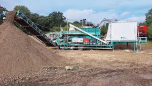 Stabilisering af lerjord med kalk på et mobilt anlæg. Metoden er relevant til overskudsjord eller hvor der ikke er plads til at plads til at blande på stedet. Efter stabilisering kan jorden indbygges. Foto: Finn Andersen.