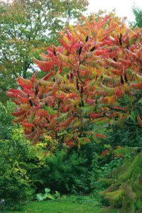 Hjortetaktræ, Rhus typhina, er også på listen over invasive arter. Men spørgsmålet om den overhovedet findes uden for haverne.Et overdrevet problem