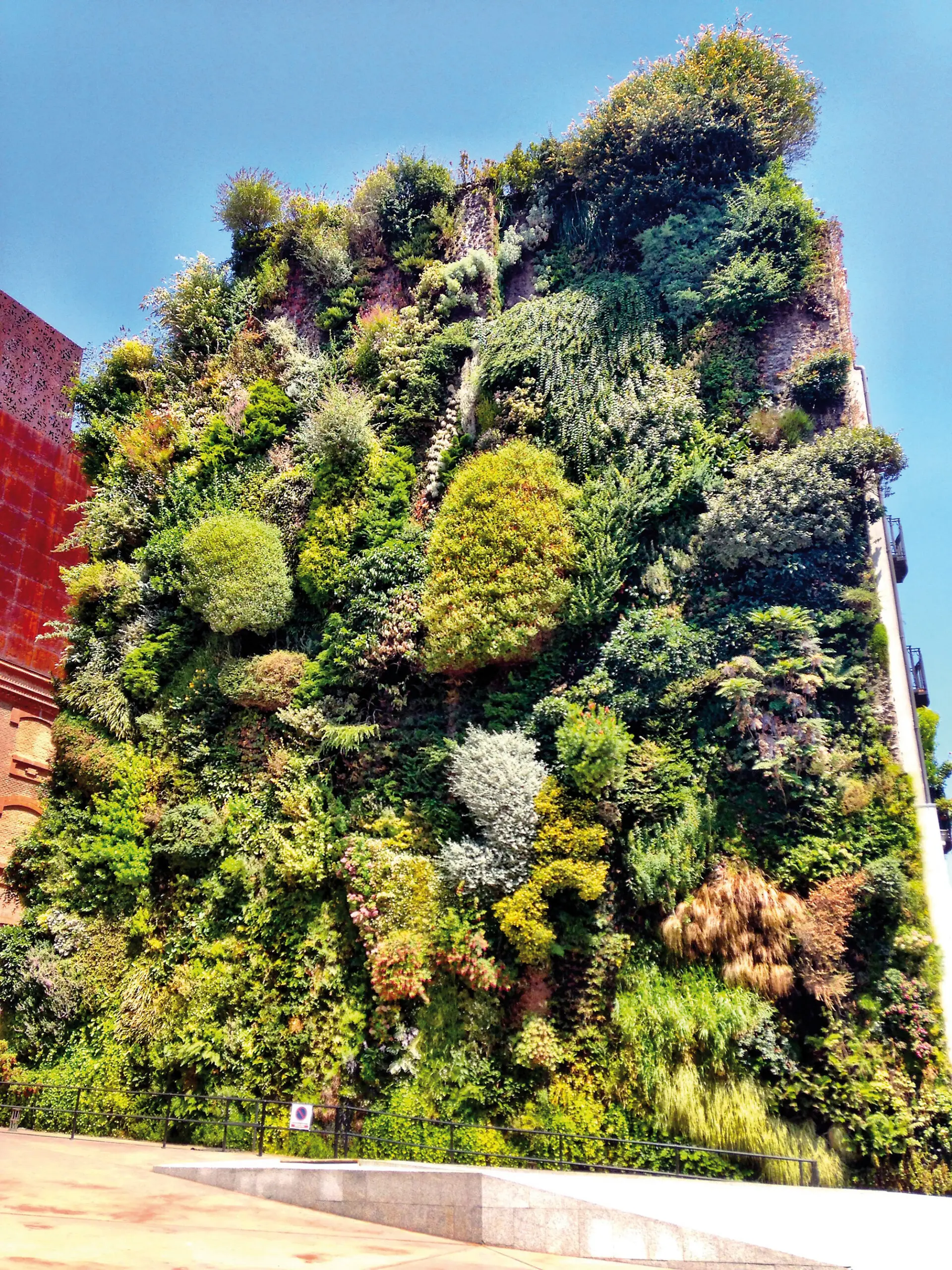 På facaden af et nedlagt kraftværk i Madrid falder facadebevoksningen i frodige, junglelignende kaskader ned over bygningsfacaden. Det er forståeligt at denne ‘vertical garden’ – Caixa Forum – hører til dem der igen og igen fremhæves når grønne facader vises i arkitekturtidsskrifter og for politikere og beslutningstagere i arkitektkonkurrencer.