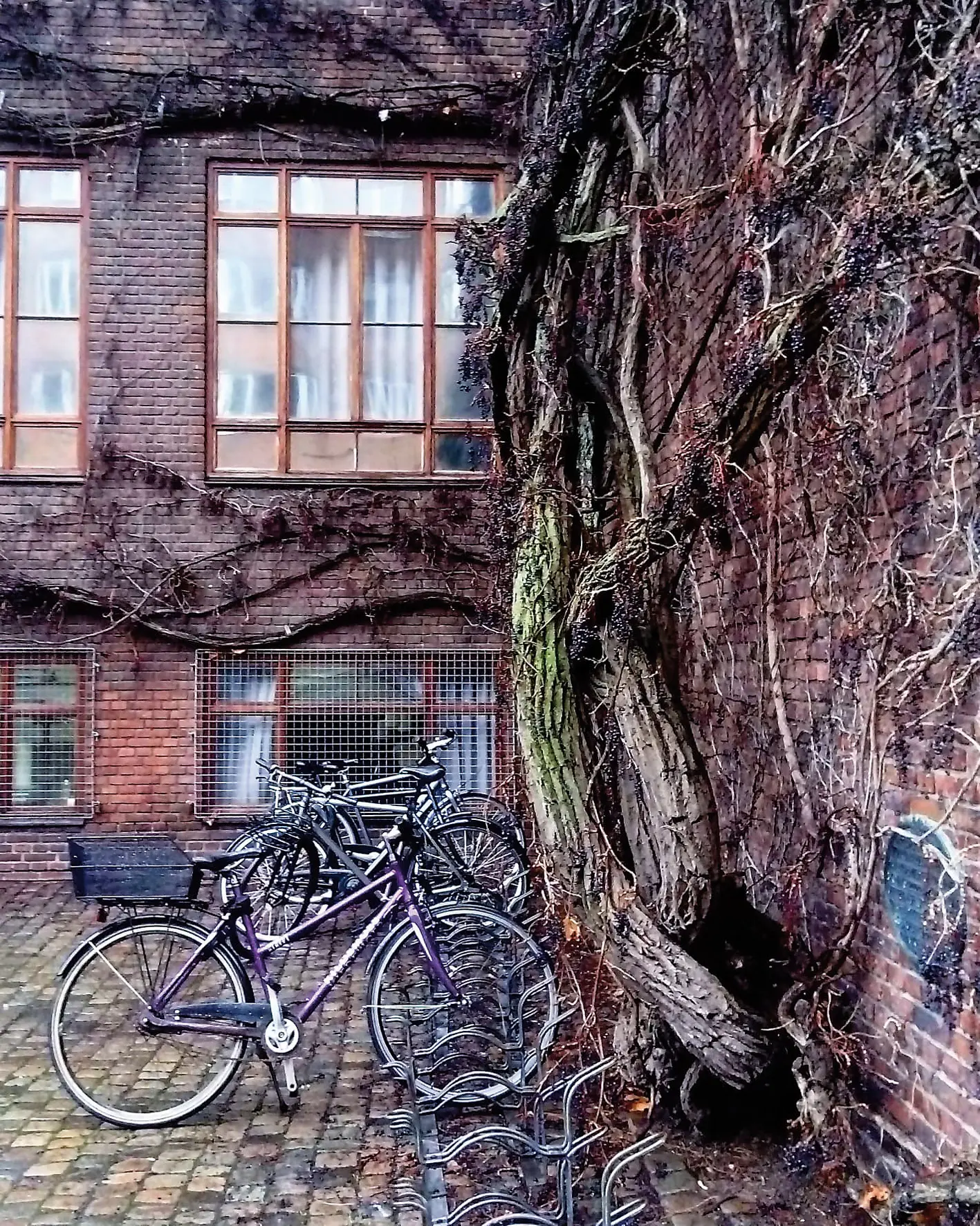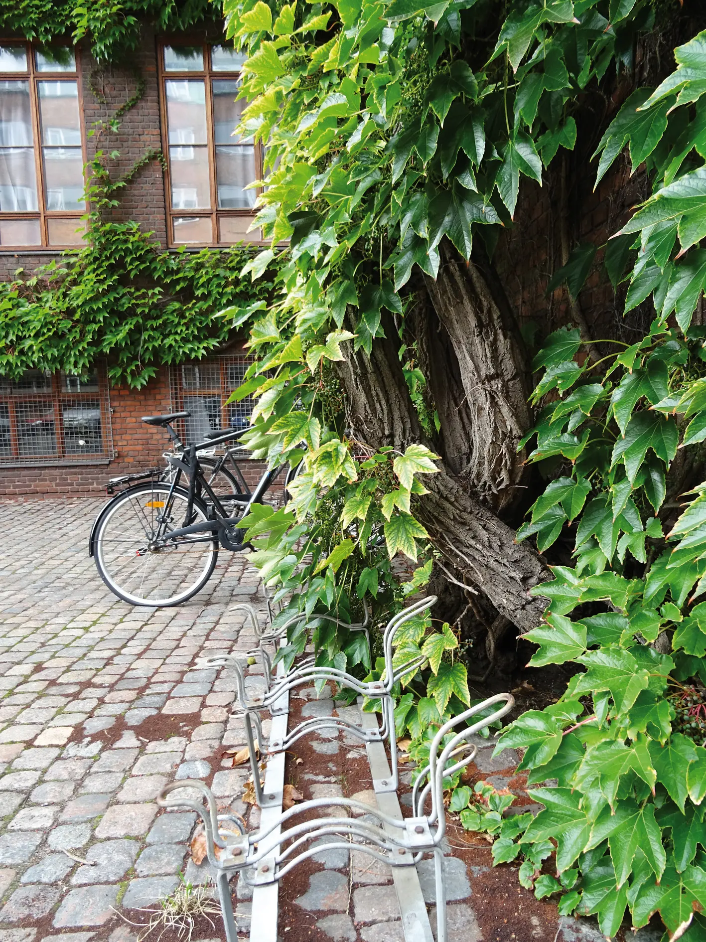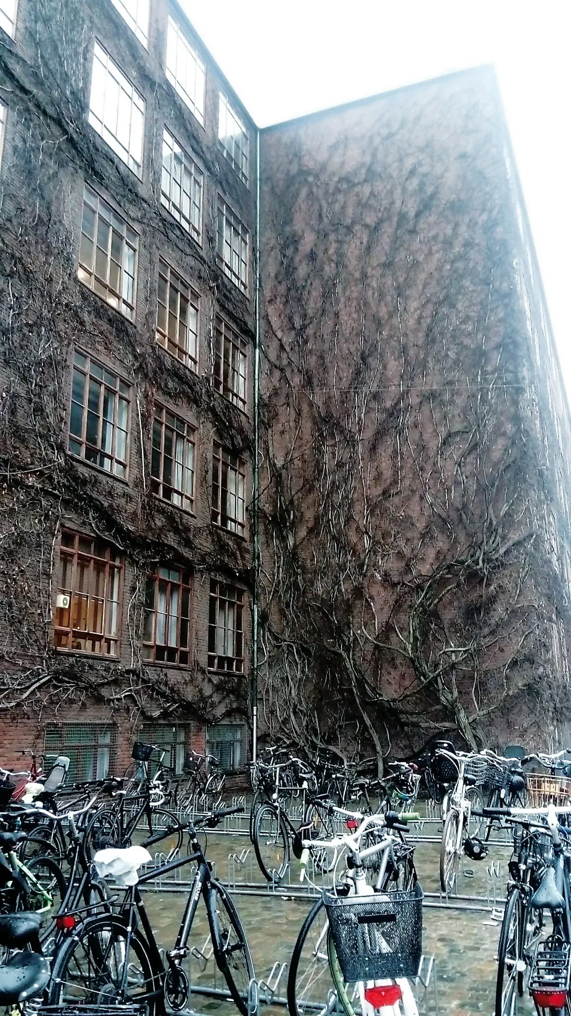 På Teknisk Skole på Frederiksberg bidrager en stor rådhusvin til at bygningen og det tilhørende byrum præges af store ændringer over et år. Gennem plantens vækst og ‘tidslighed’ er den grøn og frodig i foråret og sommeren, orange, rød og gul i efteråret mens man om vinteren kan se det massive rodnet udfolde sig på facaden. Det minder os om tiden som passerer, om planternes livscyklusser, og at det ’grønne’ i byen er langt mere end grønt. Fotos af Ann-Charlott Eriksen 2016-2019.