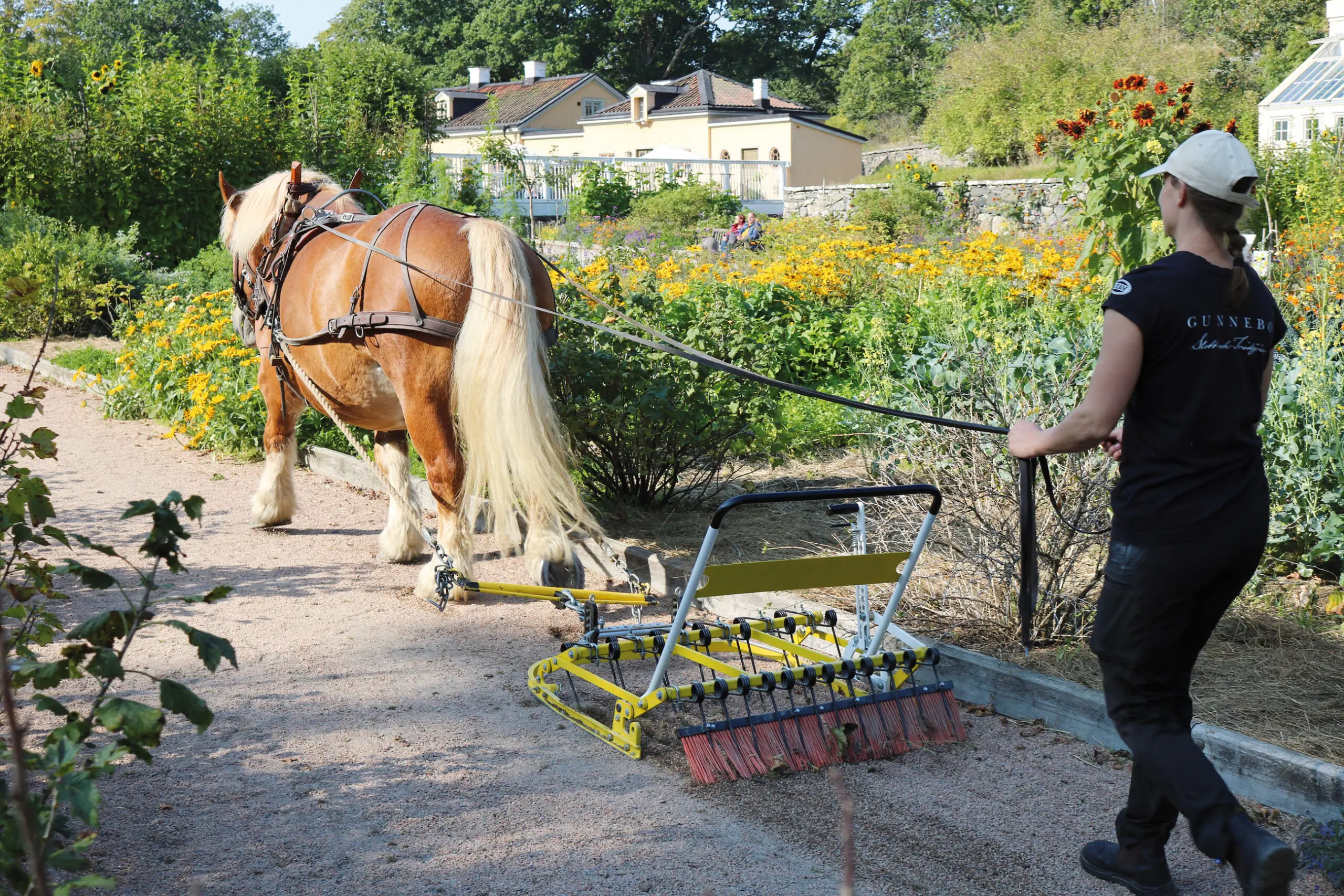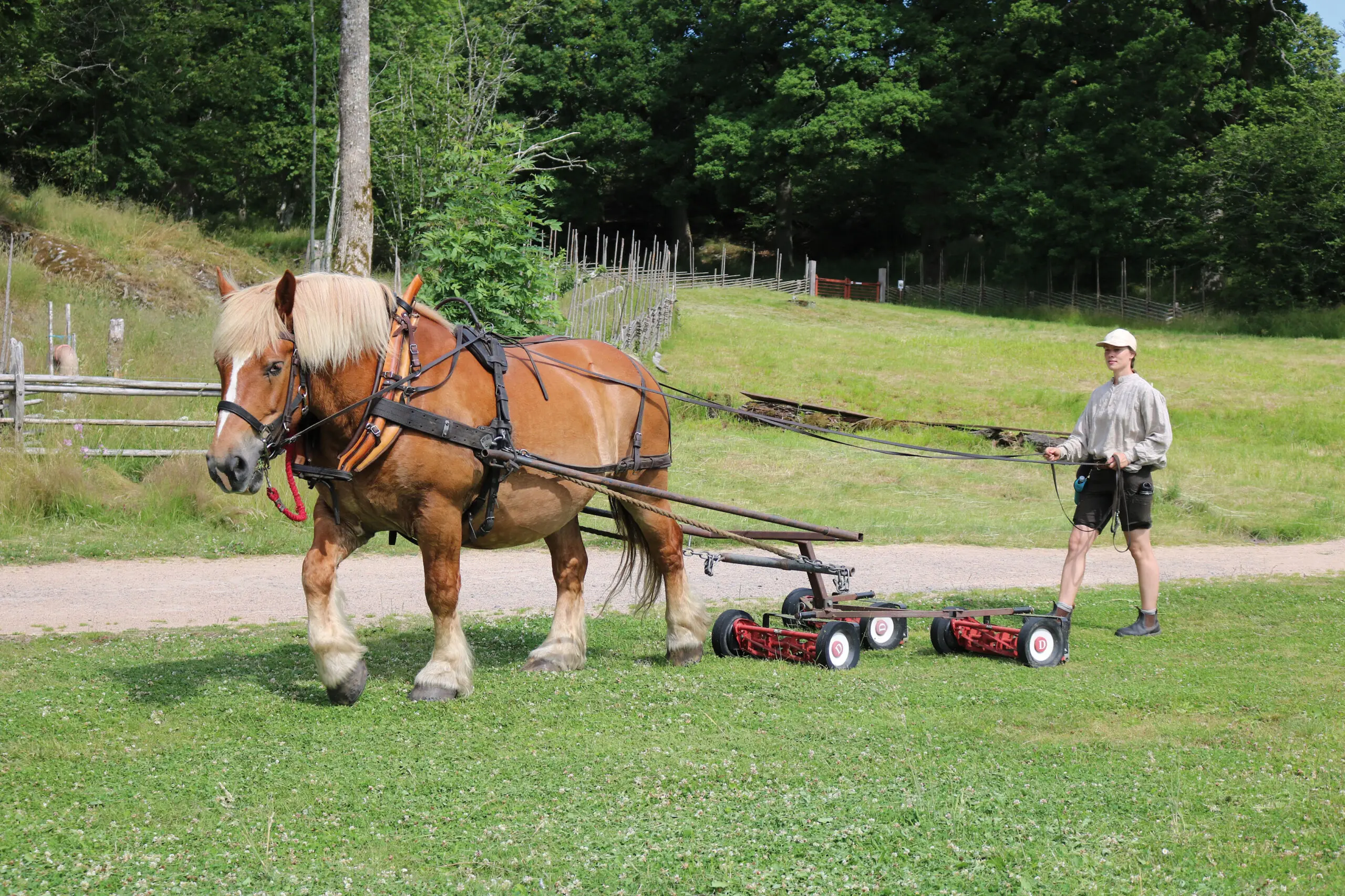 DRIFT. Sverige er foran med at bruge heste i den grønne parkdrift, bl.a. med uddannelse af kuske og specialudviklede redskaber.Siri Berg klipper græs på Gunnebo Slott och Trädgårdar. Hesten er en svensk ardenner der hedder Umar og vejer cirka 800 kg. Umar er rolig og har ingen problemer med den raslende lyd fra klipperen. Foto: Gunnebo Slott och Trädgårdar.