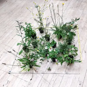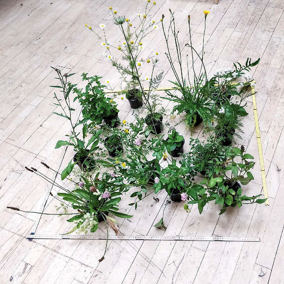 Praktisk øvelse på kurset Beplantningsdesign hvor Mona C. Bjørn tog en masse hjemmehørende planter med ind i klasseværelset for at arbejde med plantetæthed i 1:1. De studerende blev udfordret: Hvad sker der hvis vi bruger planter der er meget ens versus meget forskellige i deres vækst og spredningsform? Hvilke konsekvenser har det hvis en given plante anbefales til 6 planter/m2 hvis der ikke er taget højde for livsvarighed, spredning og vækst? Foto: Richard Hare.
