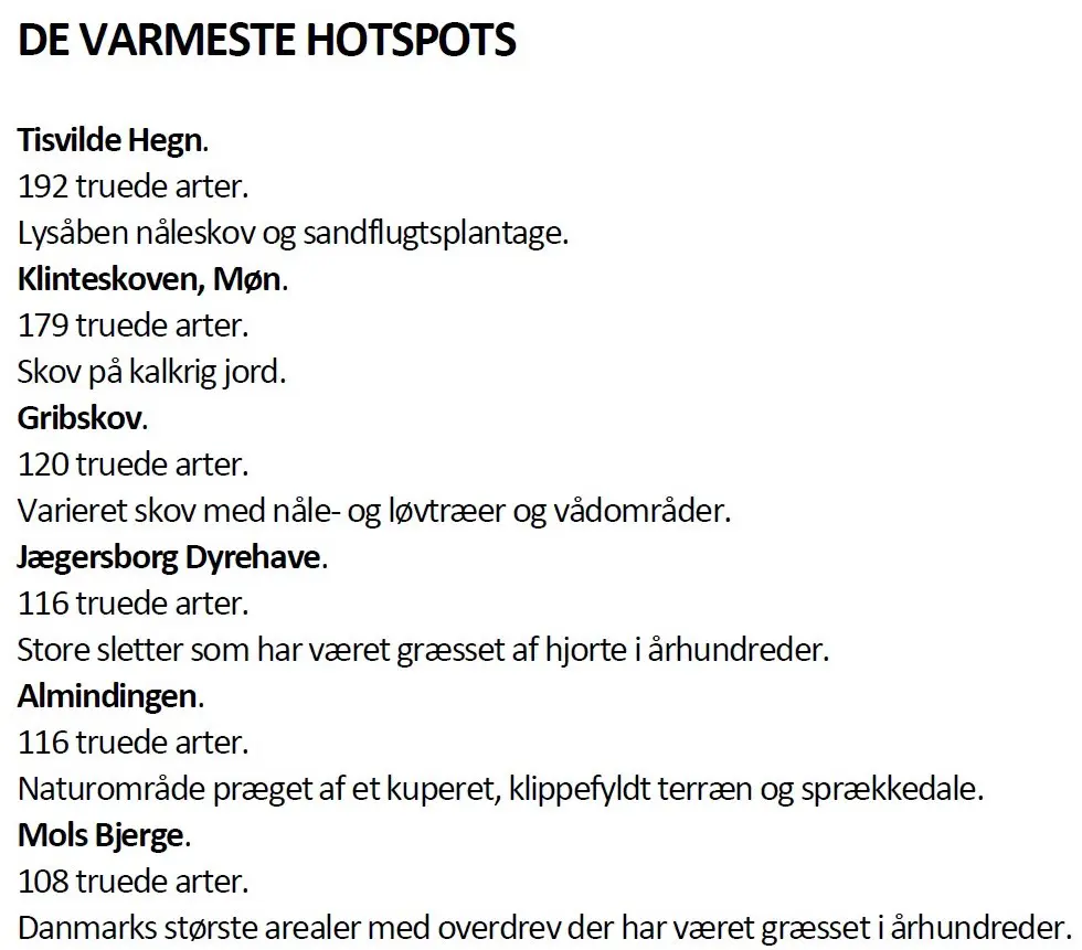 „De statslige naturområder med flest registrerede truede arter hænger ikke så overraskende sammen med steder hvor naturen har fået plads. Alle steder har deres egne specialiteter, fra Møns blomsterrigdom, over sommerfugle i Mols Bjerge til Jægersborg Dyrehaves ældgamle træer, der er guf for biller og svampe. De er alle et besøg værd – for både biologinørderne og den almindelige skovgæst,“ siger Erik Buchwald.
