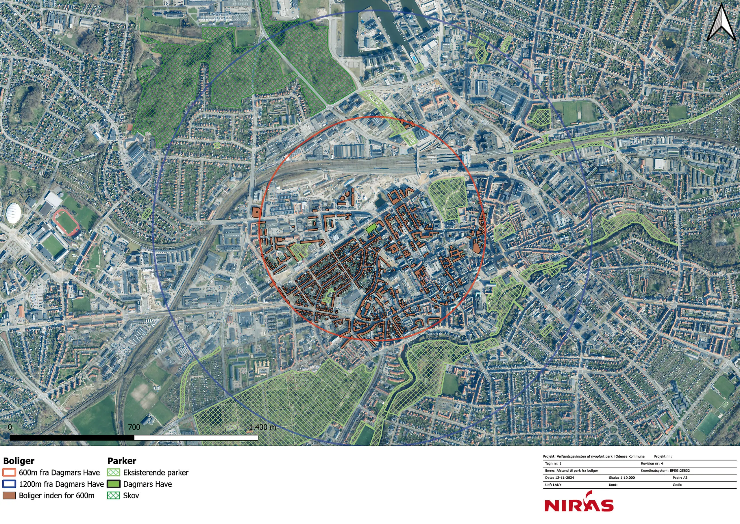 I den røde rings centrum ligger Dagmars Have. Ringen viser det område hvor der er højst 600 meter til parken. Den ligger ret isoleret fra andre eksisterende parker.