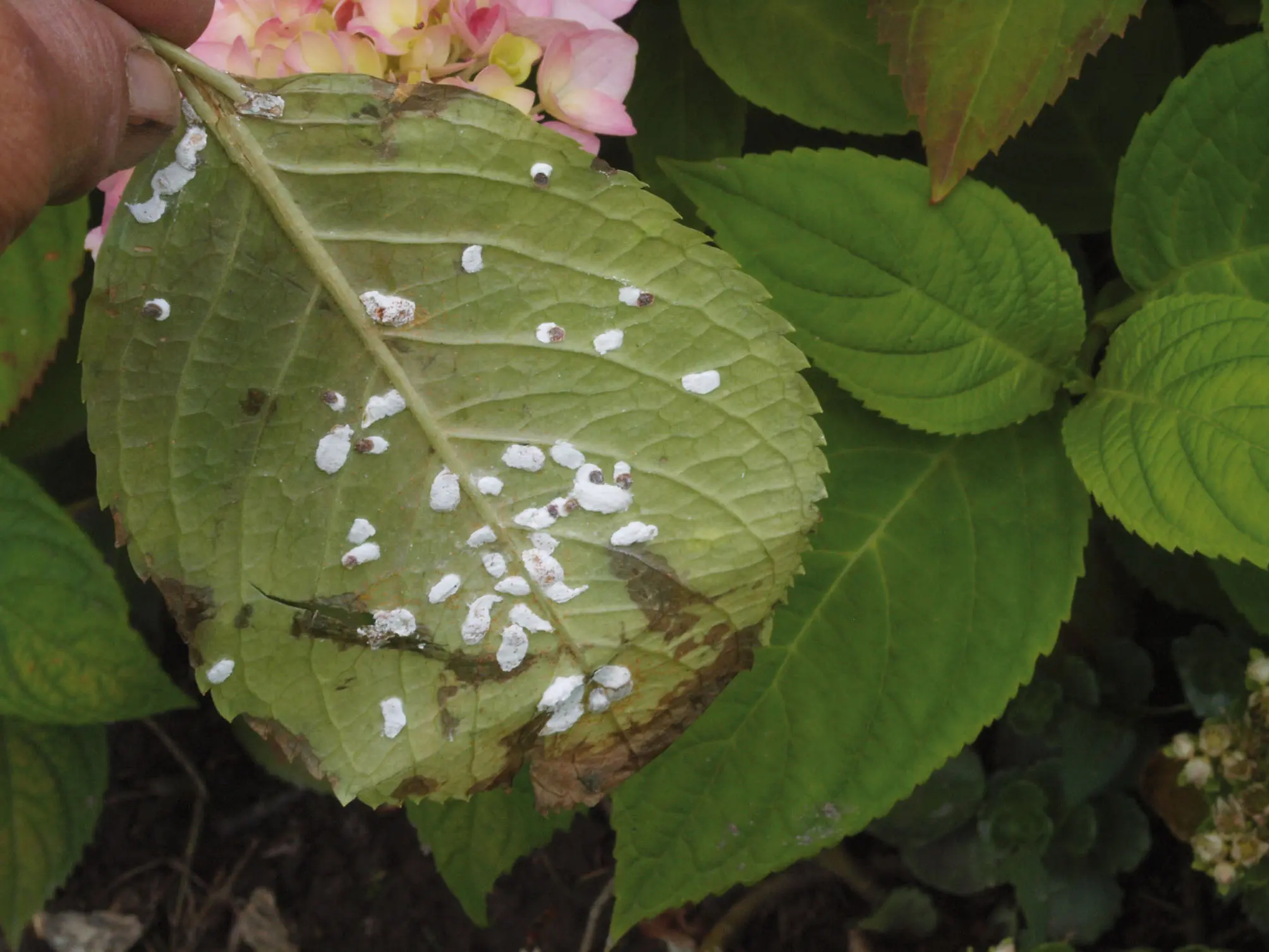 HortensiaskjoldlusenÆgsække af formodentlig hortensiaskjoldlus på hortensia. Foto: Magnus Gammelgård.