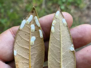 VedbendskjoldlusenVoksne hunner af rhododendronskjoldlusen i færd med at lægge æg i ægsække på undersiden af et rododendronblad.