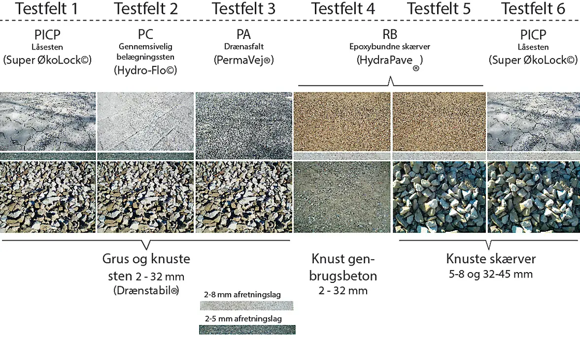 Ét felt blev konstrueret med en permeabel belægning af asfalt, ét felt med permeabelt belægningssten, to felter med beton låsesten og to felter med epoxy-bundne skærver. Med belægning menes her overfladelag mens befæstelse betegner hele opbygningen.