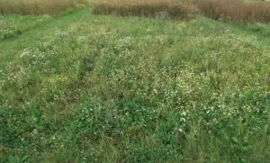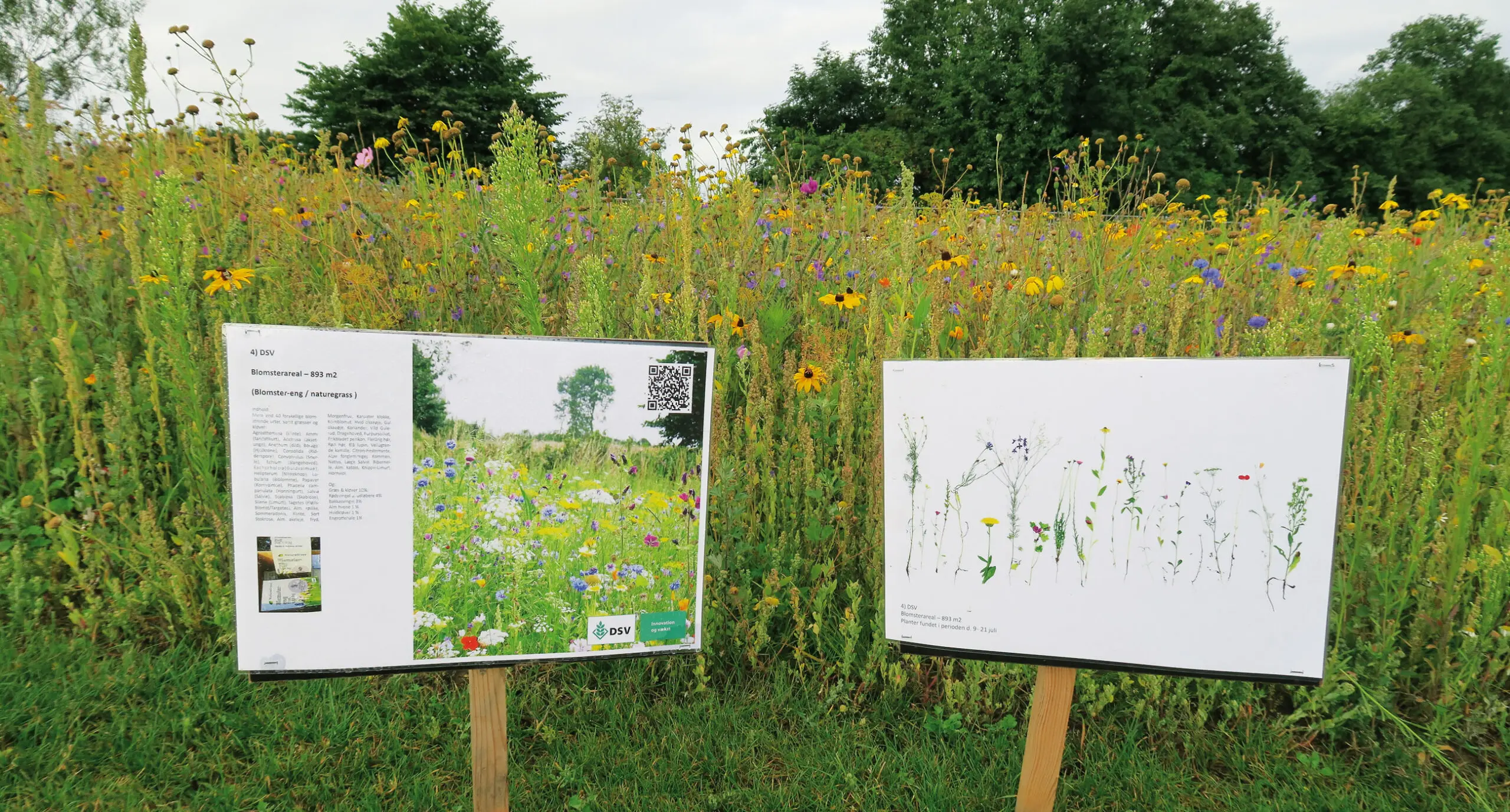 Et af de to testfelter hvor kvikgræs og agertidsel ikke var nævneværdigt til stede. Teknisk set er det vellykket med stor fremspiring og vækst, og der mangler ikke farver. Som man lige kan ane, er sådan en blomstereng ret utilgængelig, og den nære oplevelse er begrænset til at se udefra eller ovenfra. Inde i blom­sterengen er der næp­pe meget liv nede ved jorden i et skyggefuldt og køligt mikroklima.