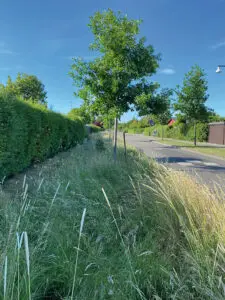AFLØB. Planter bidrager til klimatilpasningen gennem kildekontrol og forbedring af LAR’s hydrauliske funktion, men er også med til at forbedre lokalklimaet og støtte biodiversitetenTrug langs Lørenskogvej i Rødovre. Vegetationen er sået med en frøblanding med både græsser og urter. Rødderne danner en rodmåtte der sikrer god kontakt med – og dermed rensning af – det infiltrerende vejvand. Foto: Marina Bergen Jensen.