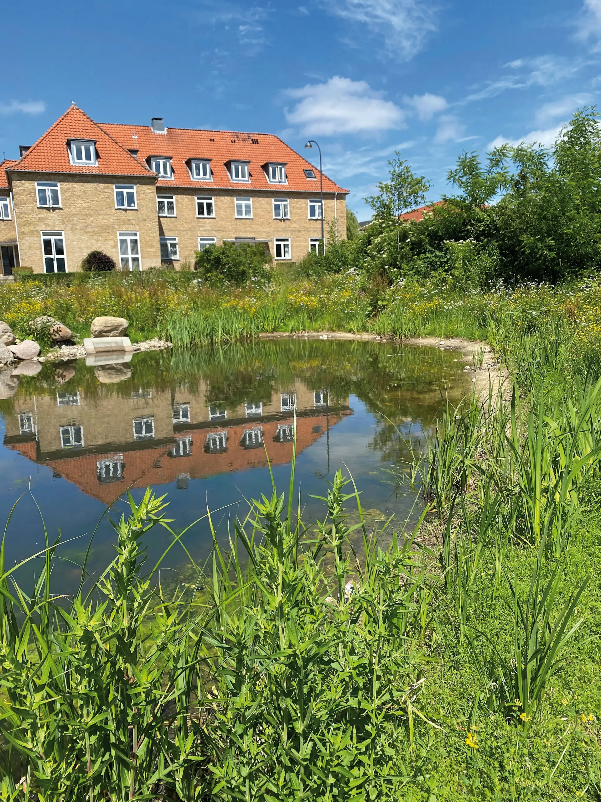 Vådt bassin med flad kant hvor vegetationen har responderet med en tydelig fugtighedsafhængig brinkvegetation. Bassinet ligger i Mosegårdskvarteret i Gentofte og er fra 2018. Foto: Marina Bergen Jensen.Forebygger forsumpning