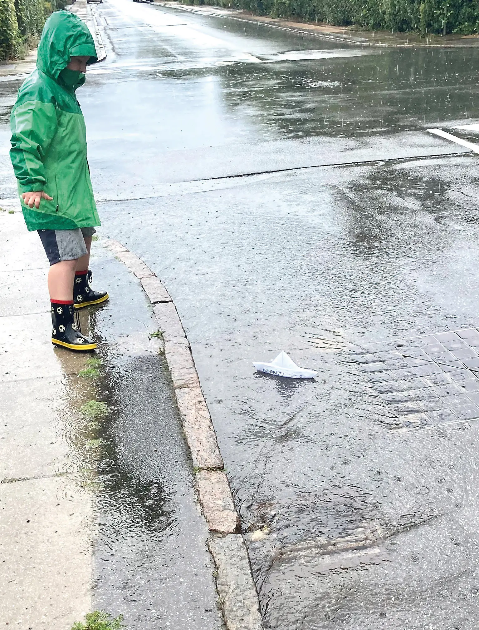 Ved hver hændelse er regnvandet løbet fint videre til det nærmeste klimatilpasningsanlæg. Vandstanden på vejene har næsten været ens for store og små regnhændelser. Vandets hastighed er bare større ved kraftig regn. Og giver de små papirbåde mere fart.KILDE