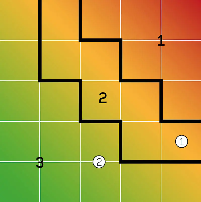 Risikomatrice med prioriteringsområder. I eksempel 1 vurderes sandsynligheden som ret lav (2), men da konsekvensen anses for meget høj (5), falder eksemplet i prioriteringsområde 2 hvor risici skal overvejes. Det kan være en sportsevent med mange tilskuere, men hvor der – ud over politi – ikke er sikkerhedstiltag til at hindre et lastbilangreb. Kilde: PET.