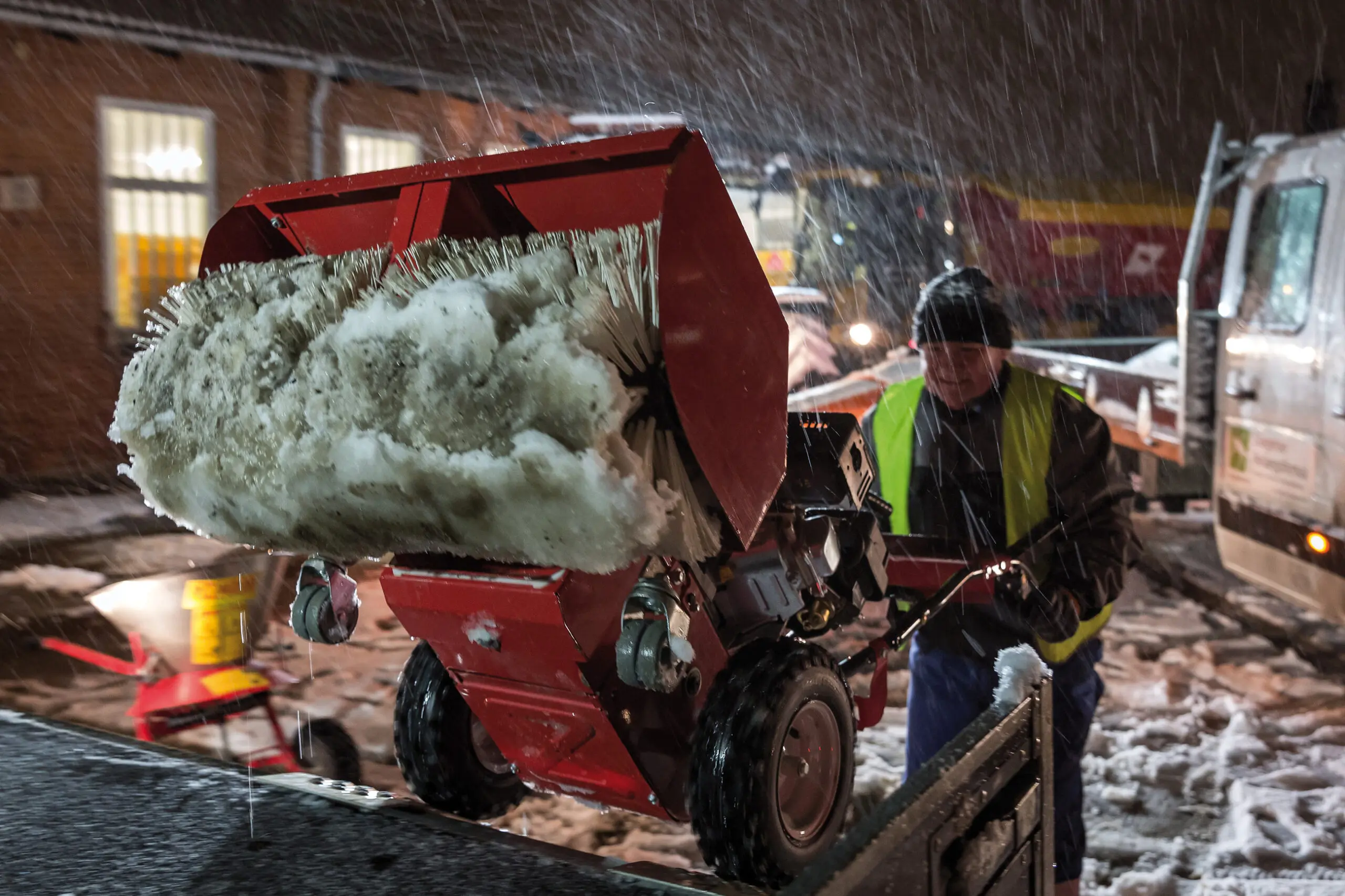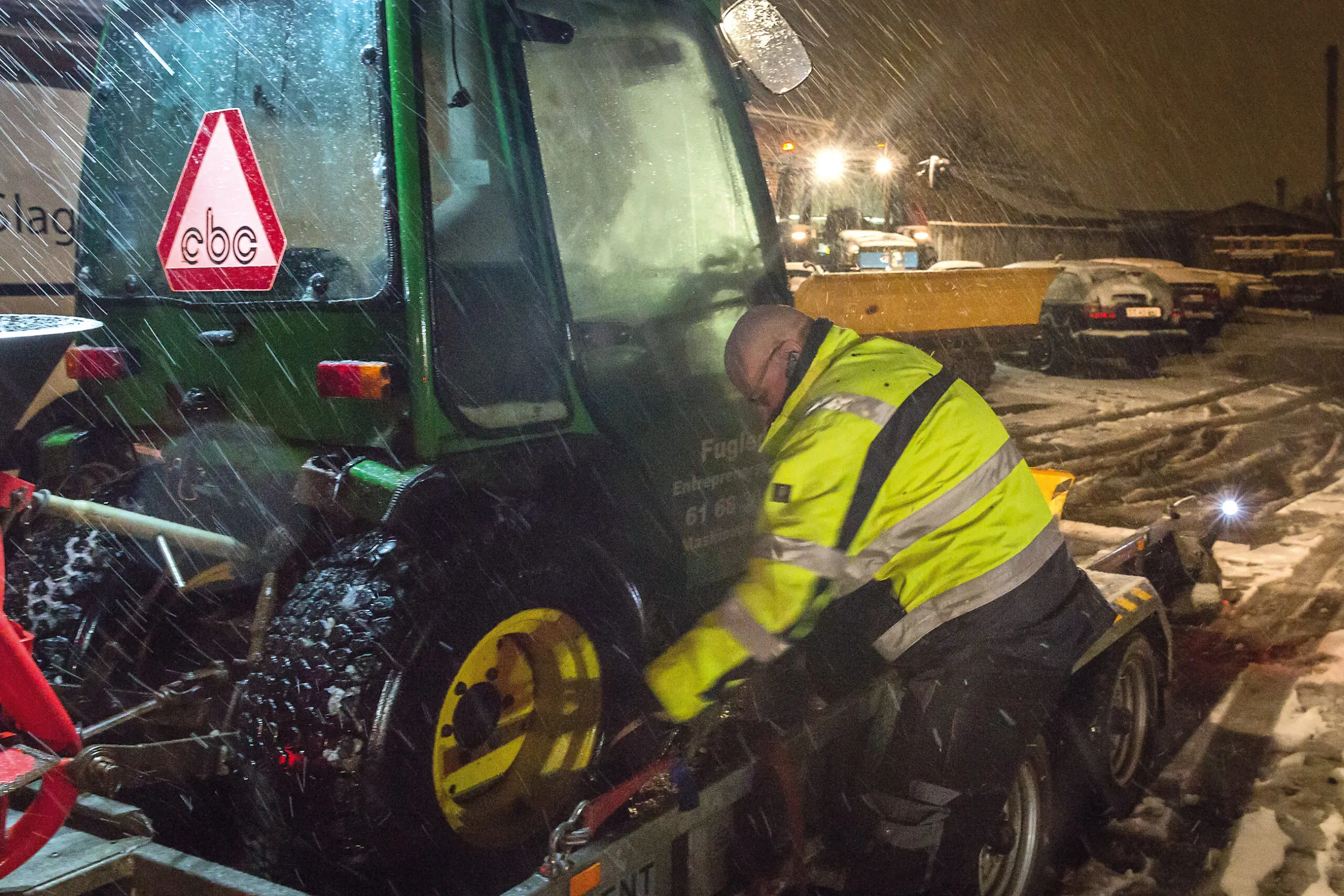At arbejde med vintertjeneste er ikke for sarte sjæle. Det er netop den slags vejr hvor de fleste foretrækker at blive indenfor: koldt, vådt og mørkt. Men i sne og slud skal posten ud. Og det kan den jo ikke komme uden en ordentlig vintertjeneste. Foto: Jens Nilausen/fotostil.dk.